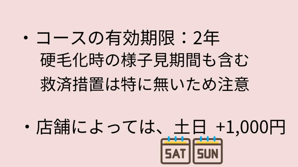| 硬毛化の場合のフォロー内容 | より強い照射をする or 半年空けるのどちらかを選択。その間に期限が切れても救済措置は無し |