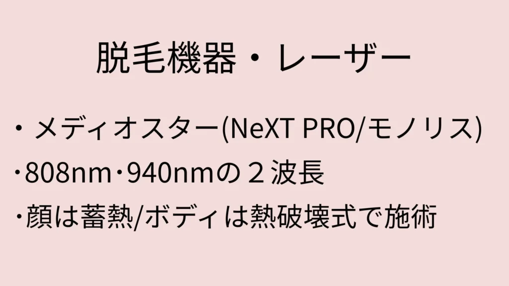 | なぜその機械を使うかの説明 | 熱破壊式と蓄熱式を部位により切替えて施術することにより、効率よく脱毛する。 |