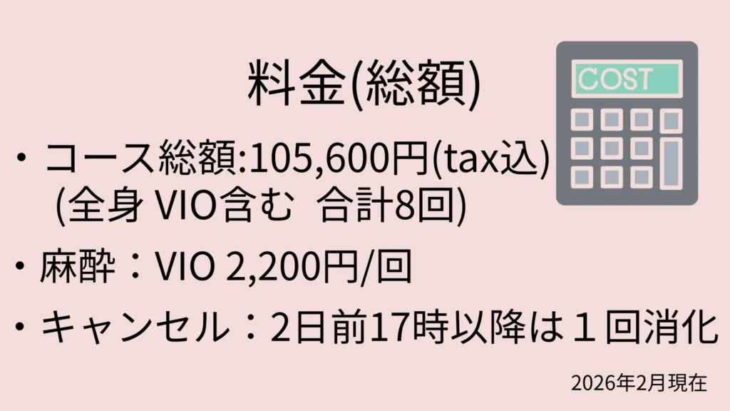 2026年2月現在はホームページ上では、全身(VIO含む)コースのみ表示です。