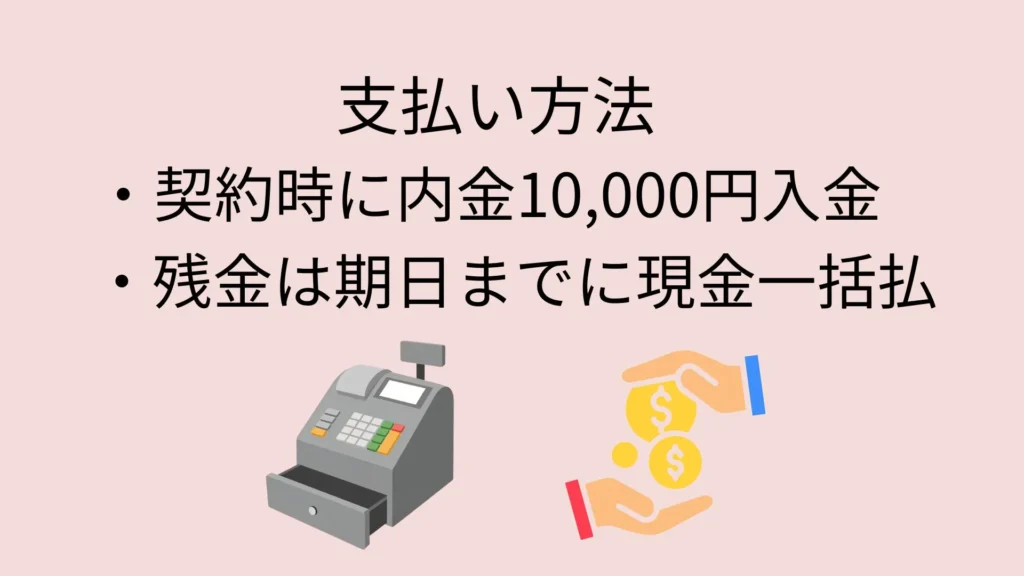| 支払い方法 | 契約時に内金10,000円を入れ、残金は指定日までに現金一括払い。 |