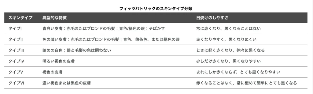 引用:MSDマニュアル家庭版よりフィッツパトリックのスキンタイプ分類
