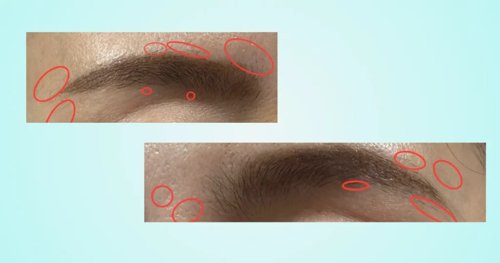赤丸で囲った眉周りの不要な毛をニードル脱毛で整えています。