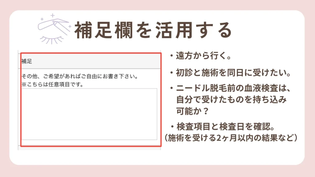 予約希望日の欄を下がっていくと、【補足】という自由記入欄があります。